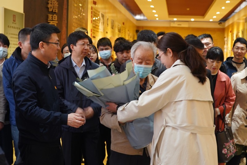 在李殿璞教授带领下,师生齐声朗读“哈军工是我们共同的母校,是我们魂牵梦绕的地方,母校有光辉的历史,母校为我们添光彩,我们要为党、为国家、为母校添光彩,建功立业!”李殿璞教授以朴实真挚的话语勉励师生,珍惜新时代带来的发展动力和历史机遇,爱党爱国,投身民族复兴大业。学生党员送上鲜花,向李殿璞教授致敬。