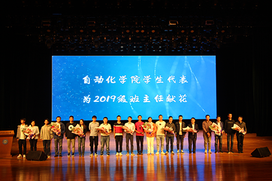 首先,党委副书记陈岩宣布自动化学院2019级新生开学第一课正式开始并致辞,随后宣读2019级本科生班主任、辅导员名单,班主任代表上台,自动化学院学生代表向班主任献花。