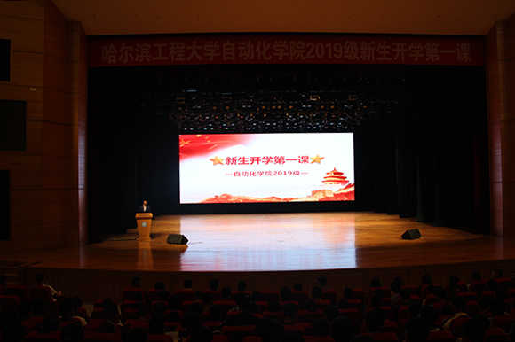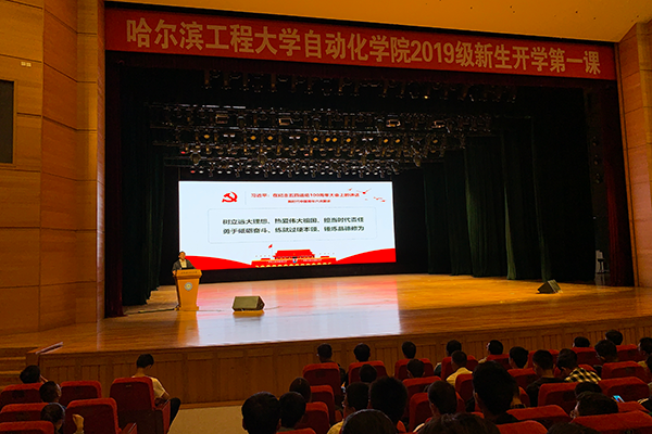 9月16日18时整,自动化学院于启航活动中心剧场举行“新生开学第一课”。自动化学院院长赵玉新,党委书记陈万海,党委副书记陈岩,行政副院长于立君,科研副院长蔡成涛,综合办公室主任陈子谦,人才培养办公室学工办主任李欣,2019级辅导员李雅倩、潘强、冯赞元,2019级本科班主任以及全体2019级新生参加本次开学第一课。
