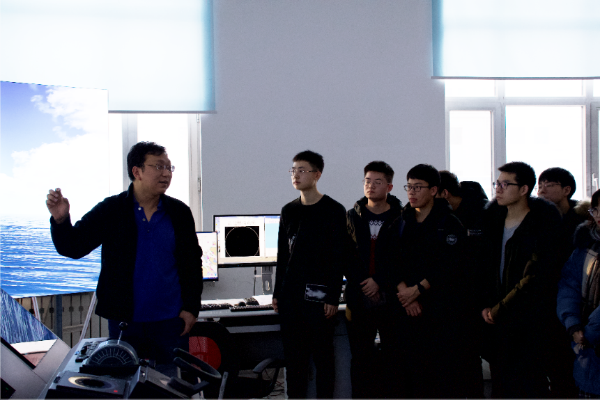 在智能船航行控制仿真实验室,刘志林老师通过真实的船舶操控台与虚拟仿真场景结合,给同学们介绍了船舶航行态势感知和智能控制原理和方法。