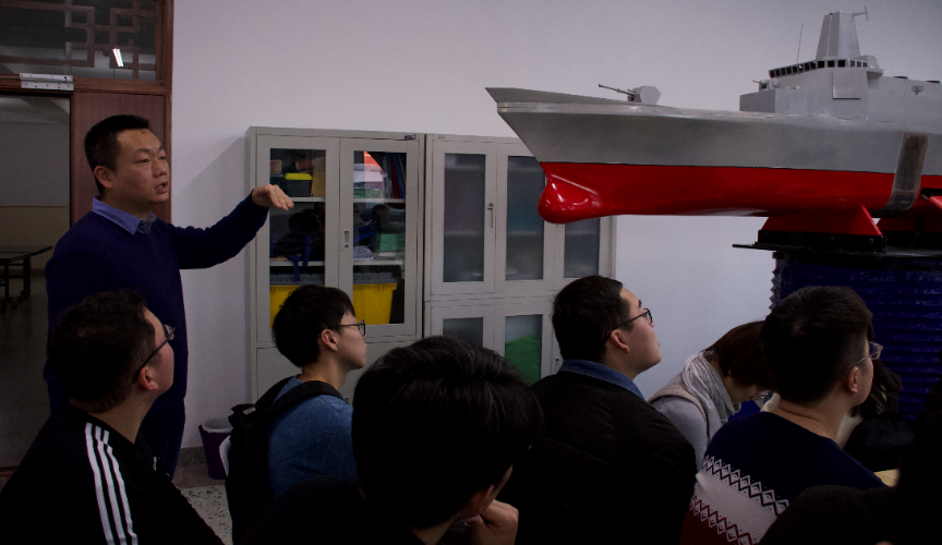 在船舶控制工程研究中心,李冰老师向同学们介绍了船舶航向、纵横摇控制方法以及实现过程。