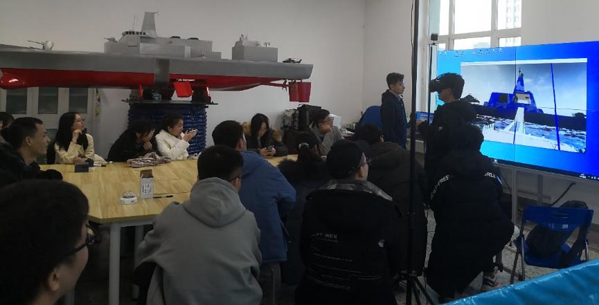 在船舶姿态仿真实验室,綦志刚老师为同学们演示了船舶姿态控制半实物虚拟仿真系统,并邀请同学戴上3D眼镜,体验船舶操控VR场景。